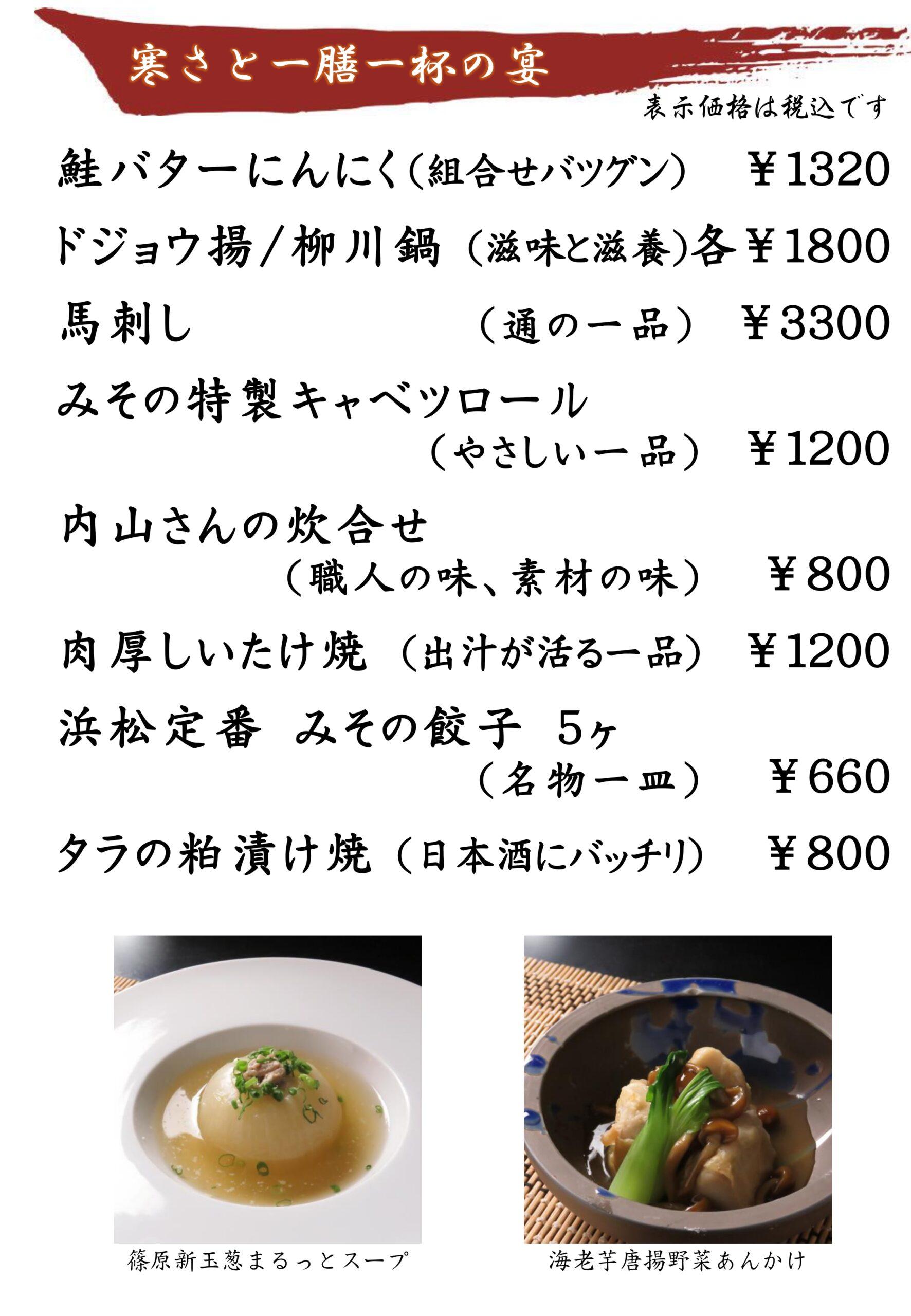 季節の一品メニューが新しくなります 2026.02.10 旬菜・板前メニューが2/11よりリニューアルいたします。まだまだ寒い日が続きますが、春の気配を感じるメニューを揃えてお待ち致しております。 Tweet Share RSS feedly Pin it 会席コースが新しくなります お花見ちらし弁当ご予約受付中 新着記事 お知らせ一覧 2026.02.27 みその感謝フェア 2026.02.17 お花見ちらし弁当ご予約受付中 2026.02.02 会席コースが新しくなります 2025.12.26 恵方巻ご予約開始いたしました 2025.12.16 第2回新酒を楽しむ会 開催のお知らせ