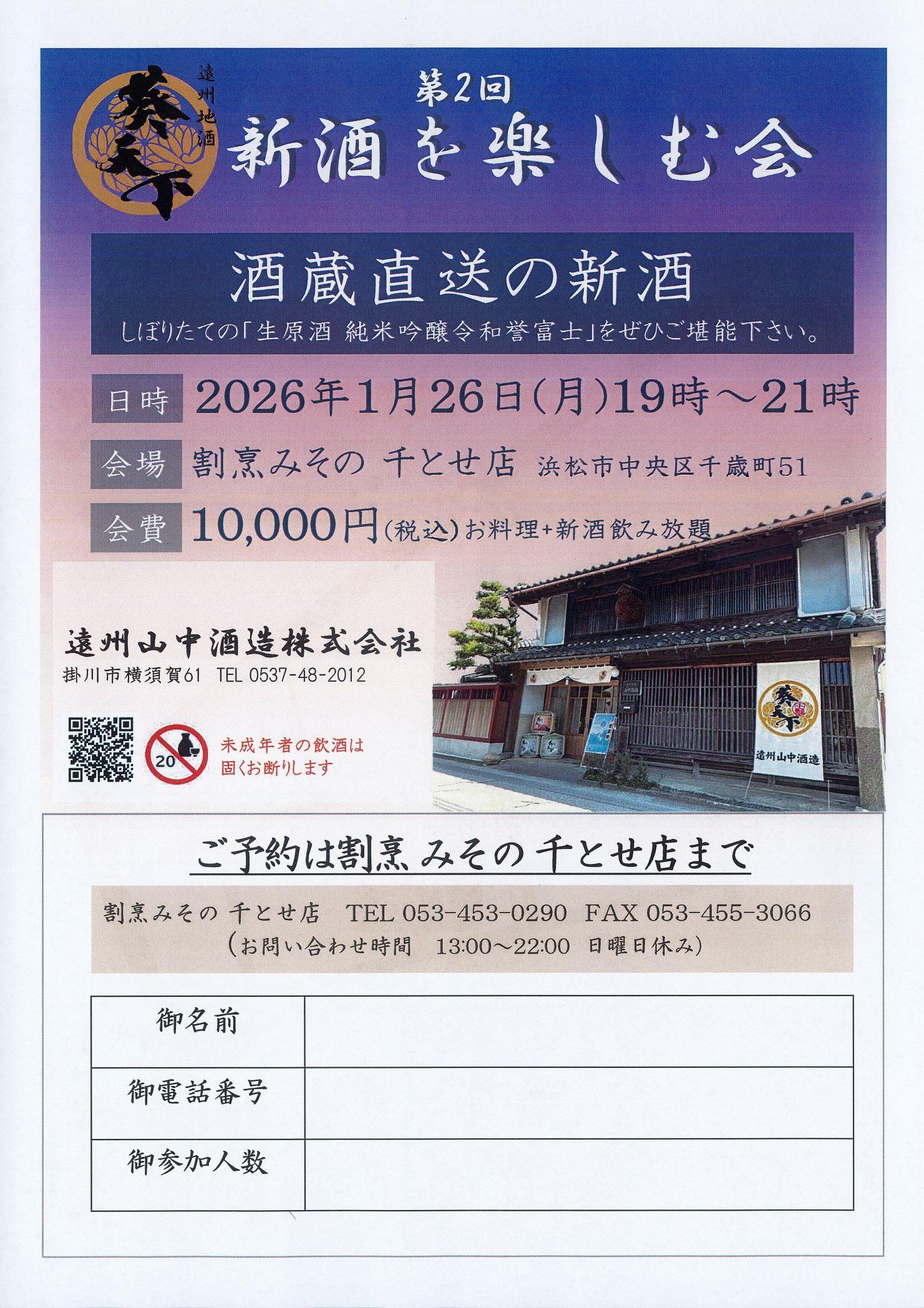 第2回新酒を楽しむ会 開催のお知らせ 2025.12.16 2026年1月26日(月)に第2回新酒を楽しむ会を開催致します。ご予約お待ち致しております。 お電話でのご予約はこちらから 割烹みその 053-453-0290 Tweet Share RSS feedly Pin it 会席コースが新しくなります 恵方巻ご予約開始いたしました 新着記事 お知らせ一覧 2025.12.26 恵方巻ご予約開始いたしました 2025.12.01 会席コースが新しくなります 2025.11.27 ふぐ・かき 料理取り揃えております! 2025.11.27 初雪の旬菜・板前メニュー始まります 2025.11.26 年末年始の営業予定