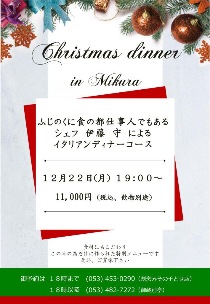 毎年ご好評をいただいておりますクリスマスディナーの予約受付を開始いたしました。今年も皆様に心温まるひとときをお届けしたいと思っております。是非特別な夜を御蔵別亭にてお過ごしください。皆様のご予約お待ち致しております。
